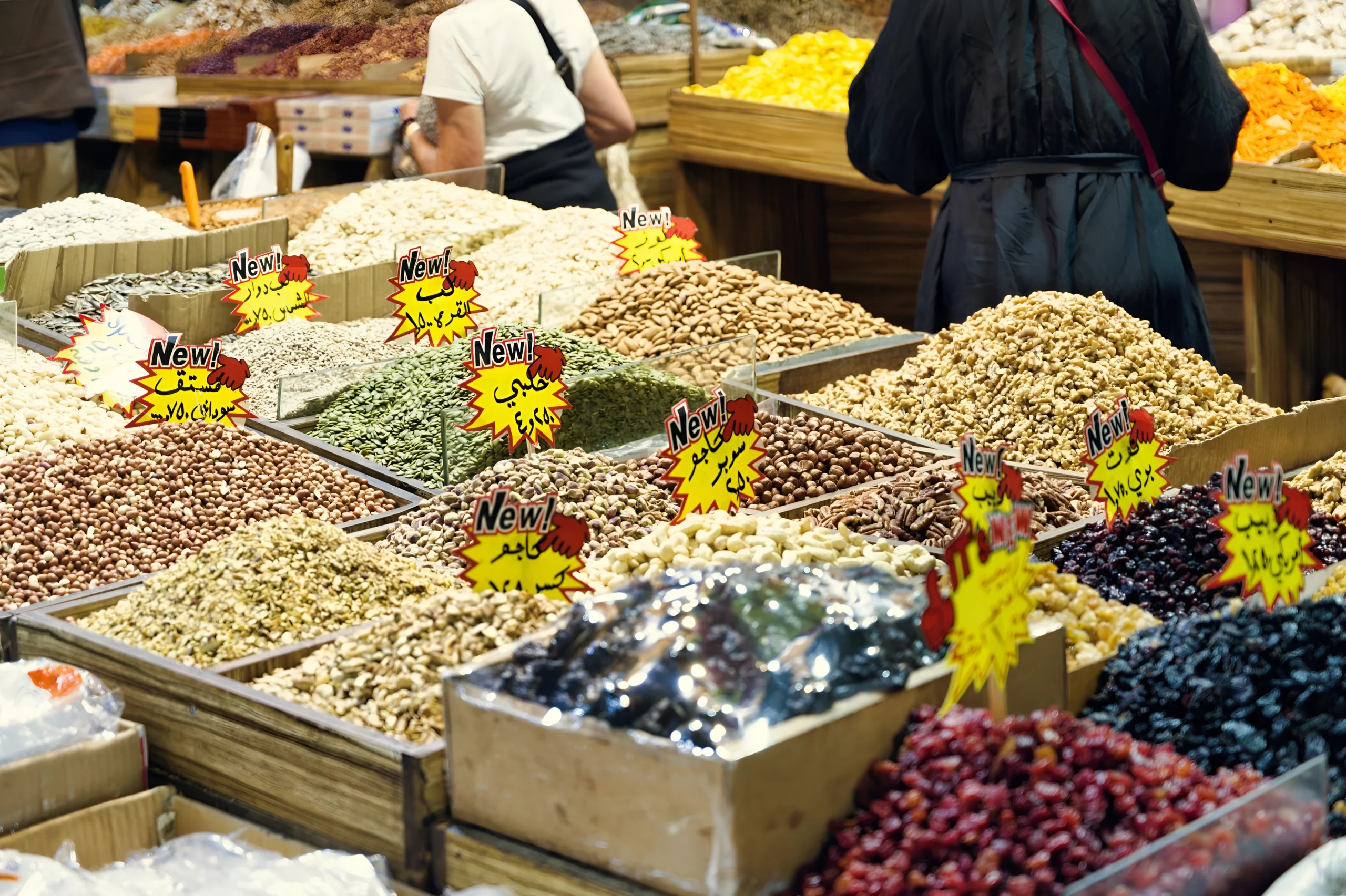 Les étals de fruits secs et d’épices composent au coeur du souk une mosaïque de couleurs et de saveurs. Pistaches, amandes, cacahuètes, pignons de pin côtoient les lentilles corail, les pois chiches et les graines de courge dans des bacs en bois aux nuances allant du beige clair au brun foncé. Des étiquettes jaunes annoncent les nouveautés, témoignant du dynamisme commercial du lieu. La lumière naturelle souligne chaque grain, chaque texture, transformant les denrées en objets de contemplation visuelle. Cette abondance organisée révèle l’importance des produits secs dans la gastronomie locale et dans le commerce traditionnel du Levant, où ces denrées constituent à la fois nourriture quotidienne et monnaie d’échange culturelle.