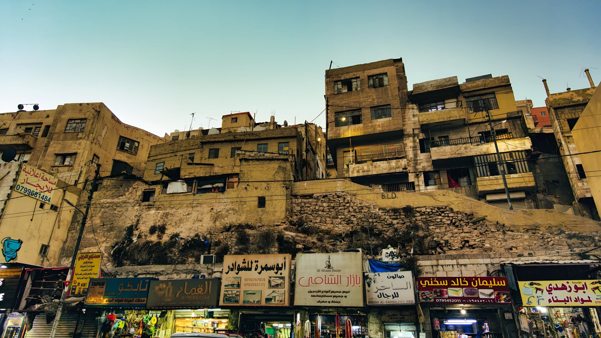 L’architecture vernaculaire d’Amman se reconnaît à sa pierre ocre, taillée dans le calcaire local qui donne à la ville sa lumière particulière. Les bâtiments superposés, aux façades patinées par le temps, racontent un urbanisme dense et organique hérité des médinas historiques. Au rez-de-chaussée, une succession de petits commerces anime la base de ces constructions : enseignes en arabe, vitrines colorées, numéros de téléphone peints sur les murs. La lumière rasante du jour révèle les fissures et les variations chromatiques de la pierre, soulignant la coexistence entre l’architecture millénaire et les marqueurs de la modernité. Cette tension visuelle est caractéristique des villes historiques en mutation, où chaque façade est à la fois archive et présent.
