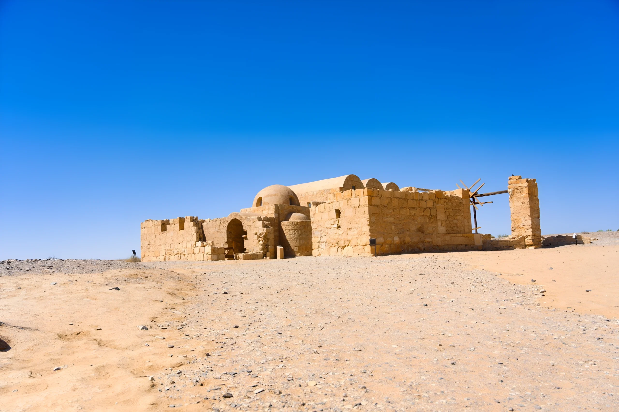 Qusayr ‘Amra appartient à cette catégorie de lieux qui résistent à la description. On peut en donner les coordonnées, l’époque, la superficie, le nom de la dynastie qui l’a fait construire. Mais aucune de ces données ne prépare vraiment à ce que l’on ressent en arrivant sur le site : un édifice compact, aux dômes arrondis, posé dans l’immensité minérale du désert de Zarqa, comme si la pierre avait décidé, seule, de tenir debout.