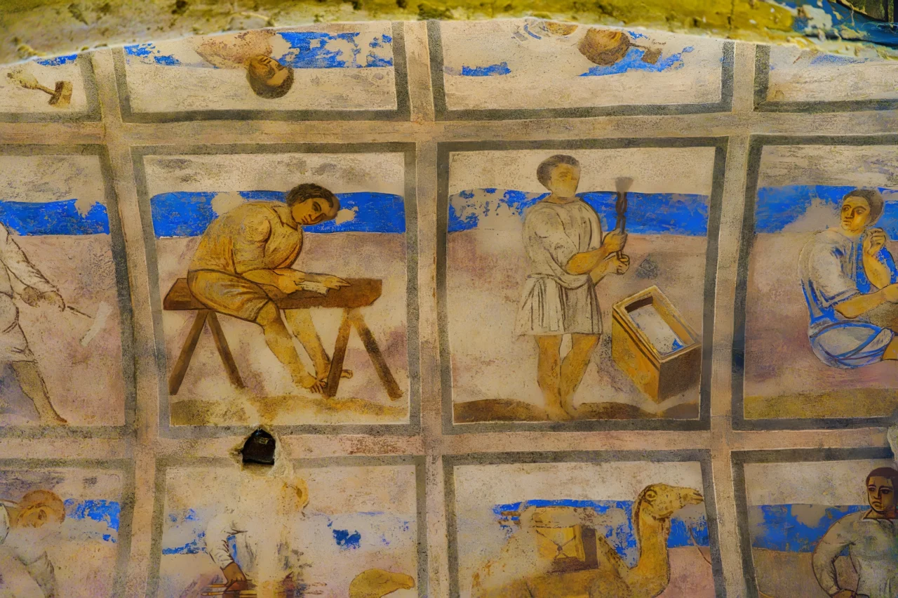 En registres superposés, la fresque organise le travail comme une partition. À gauche, un ouvrier façonne le bois sur un établi. Au centre, un artisan manipule un outil devant un coffre. À droite, d’autres figures poursuivent leurs tâches avec la même concentration silencieuse. Les teintes ocre et jaune des vêtements contrastent avec les bandes bleues qui structurent l’espace. L’usure du temps a fragmenté certains détails, laissant des lacunes qui renforcent l’authenticité archéologique plutôt qu’elles ne l’affaiblissent. Cette représentation témoigne de l’importance accordée aux métiers manuels dans l’iconographie antique. Le travail n’est pas ici une activité secondaire : il est au coeur du récit, au coeur de l’identité collective. Les gestes figés dans la pierre capturent une économie artisanale sophistiquée, révélant les techniques et l’organisation d’une époque que seules ces images permettent encore d’approcher.
