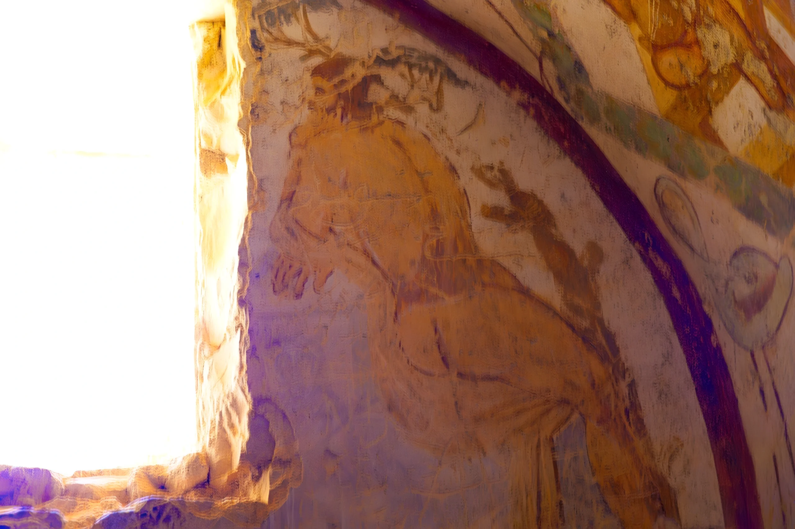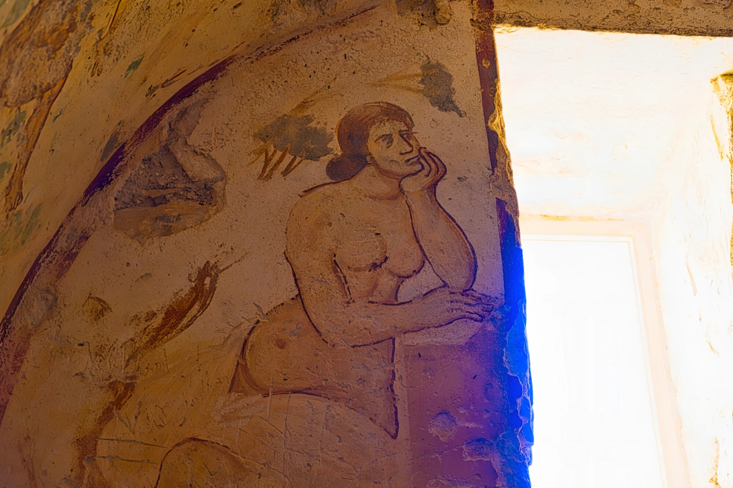 Deux figures se font face sur l’enduit ocre d’une paroi ancienne. Leurs contours sont tracés avec une économie de moyens qui renforce l’intensité du moment capturé. Le style linéaire, la nudité des formes, l’absence de tout ornement superflu : tout ici converge vers l’essentiel. La lumière naturelle, pénétrant par l’ouverture adjacente, modèle les reliefs de la surface et accentue les ombres portées. Cette interaction entre la clarté et la matière brute crée une atmosphère méditative. On ne sait pas exactement ce que ces deux figures se disent, ni ce qu’elles représentent dans l’iconographie omeyyade. Mais leur face-à-face a quelque chose d’universel, une tension entre deux présences, une conversation suspendue dans le temps. La fresque ne livre pas son sens facilement. Elle invite à rester, à regarder encore, à laisser le silence faire son travail.